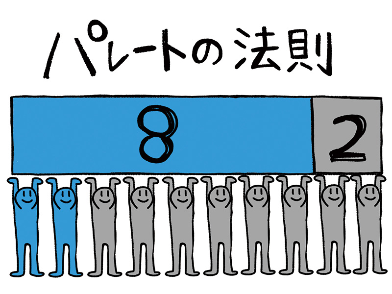 パレートの法則・・・「2:8の法則」とも呼ばれる。顧客全体の2割である優良顧客(リピーター)が売上の8割をあげているという法則