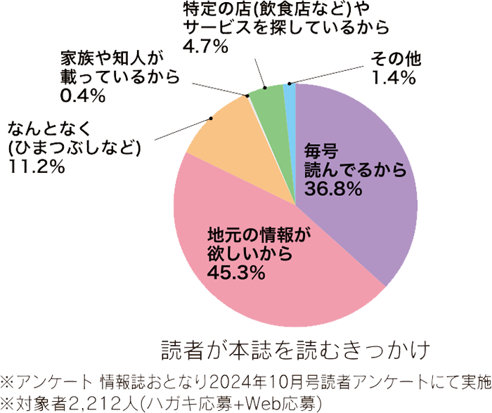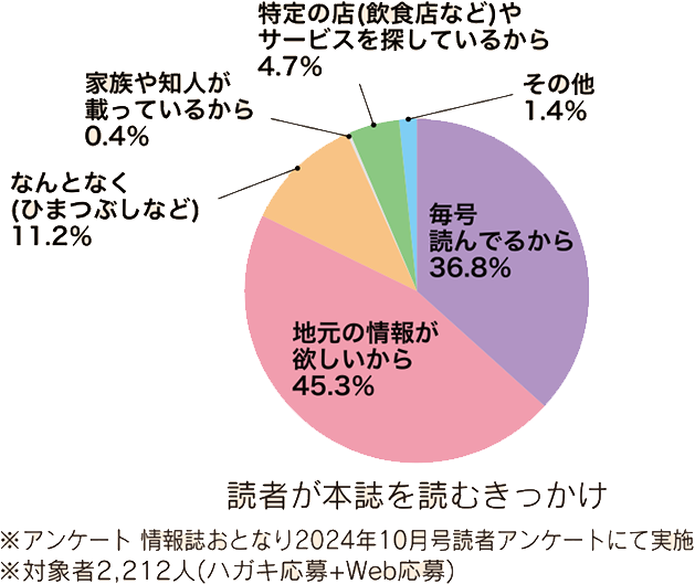 WEBのように「あの店を調べたい」など明確な目的があって情報を取りにいくような「顕在ニーズ」はありません。しかし、家にいる時にふらっと読んで目に入ってくる「情報」から新しい「潜在ニーズ」を生む事が出来ます。また固定で読んでいただいているので「毎号読んでいるから」「 地元の情報が欲しいから」「なんとなく」と利用用途が明確でない読者が全体の9割を超えます。
