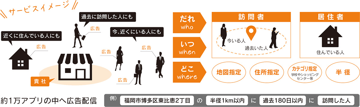 低コストでシンプルな設定で、ターゲット周辺に「今いる人」「住んでいる人」「過去に訪問した人」のスマートフォンへ、チラシ配りの感覚で広告配信ができるサービスです。